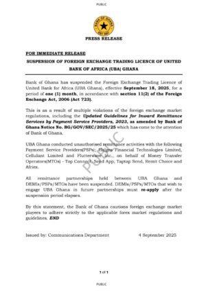 ACCRA — The Bank of Ghana (BoG) has suspended the foreign exchange trading license of United Bank for Africa (UBA) Ghana for one month, effective September 18, 2025.