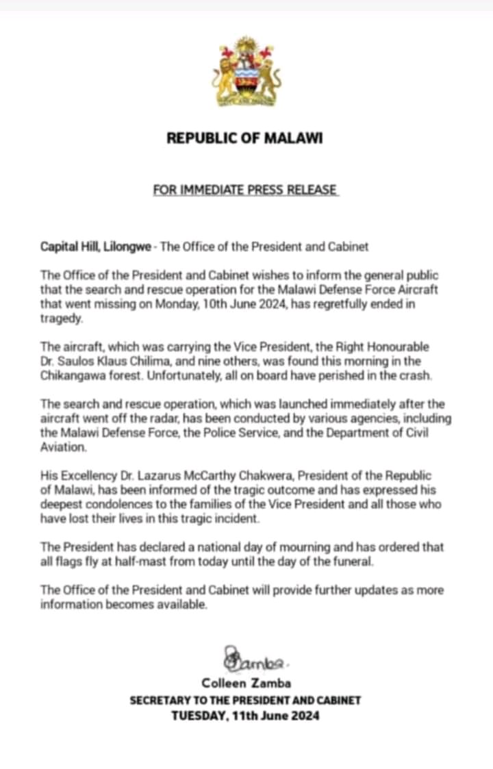 President Chakwera had announced the death of his Vice President and the nine others on Tuesday morning, June 11, 2024.