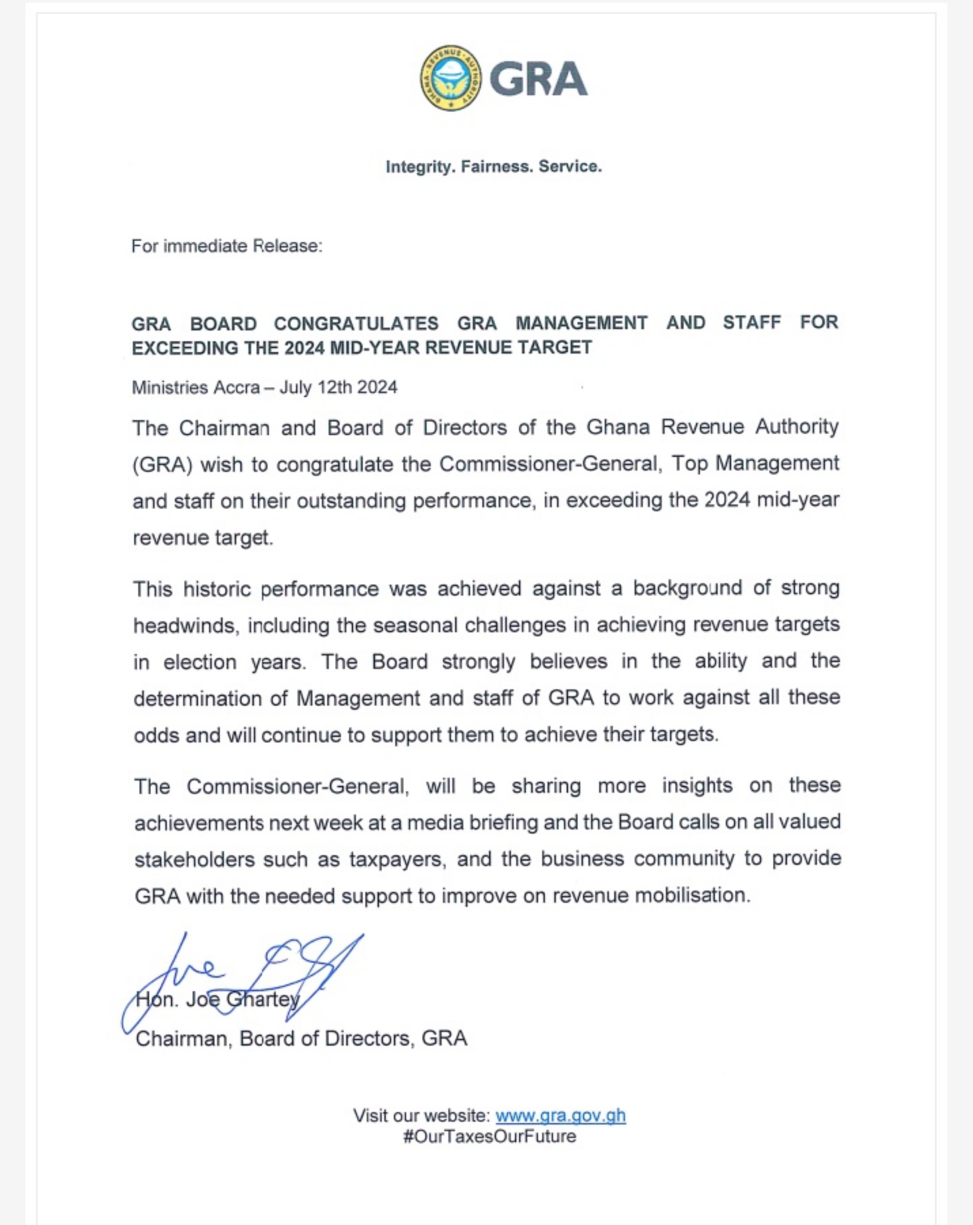 The Board of Directors of the Ghana Revenue Authority (GRA) chaired by Hon. Joe Ghartey, has congratulated the Commissioner-General, and top management and staff of GRA for exceeding the 2024 mid-year revenue target of the GRA.